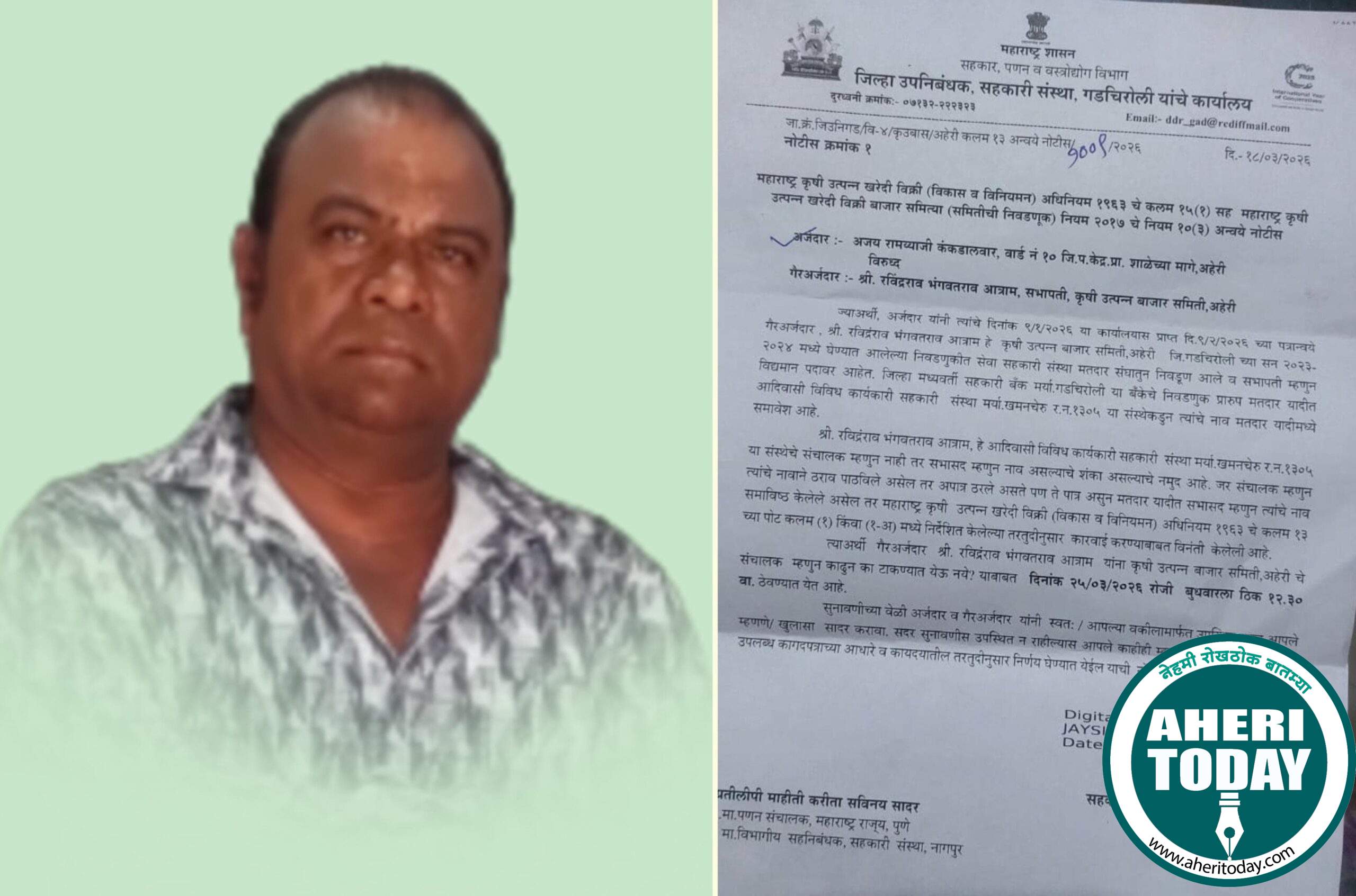 नोटीसमध्ये गैरअर्जदार म्हणून श्री.रविंद्र बाबा आत्राम सभापती कृषी उत्पन्न बाजार समिती अहेरी) यांचे नाव नमूद करण्यात आले आहे.तसेच प्रकरणात आदिवासी विविध कार्यकारी सहकारी संस्था मर्यादित (नोंदणी क्र. ३७३०) या संस्थेचाही संदर्भ देण्यात आला आहे.
